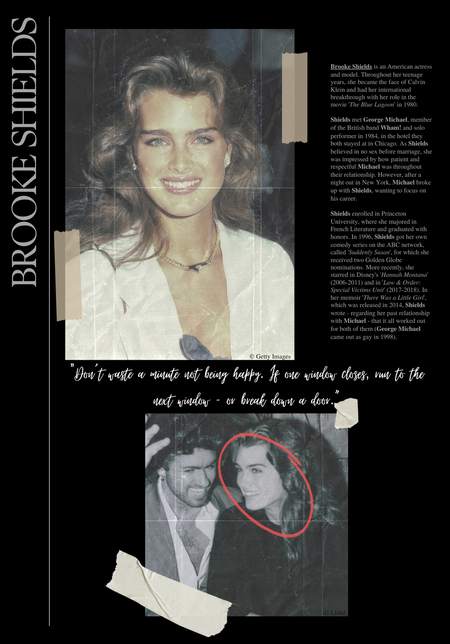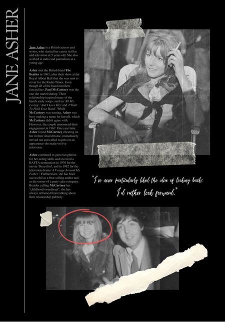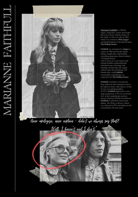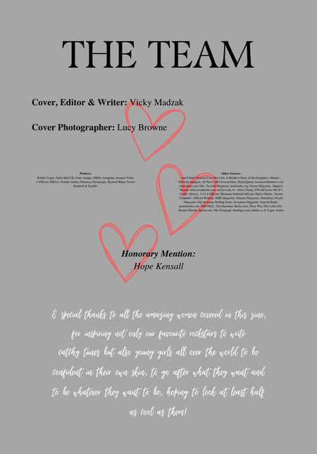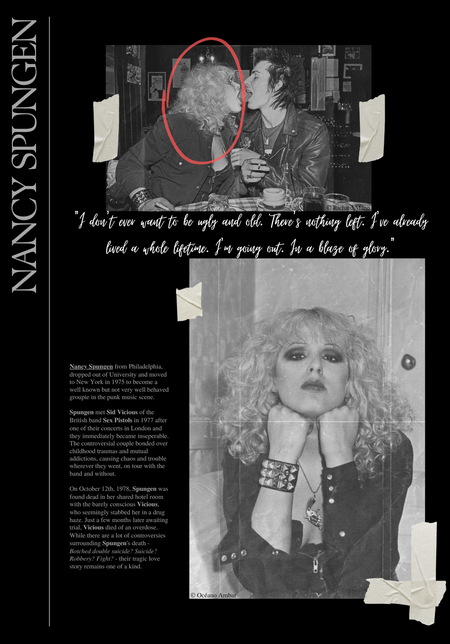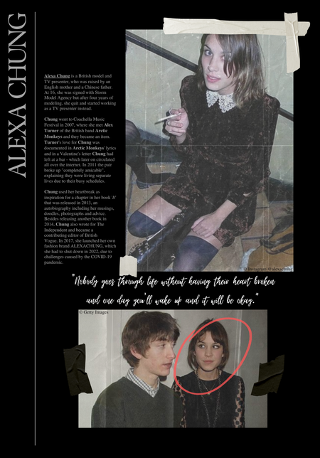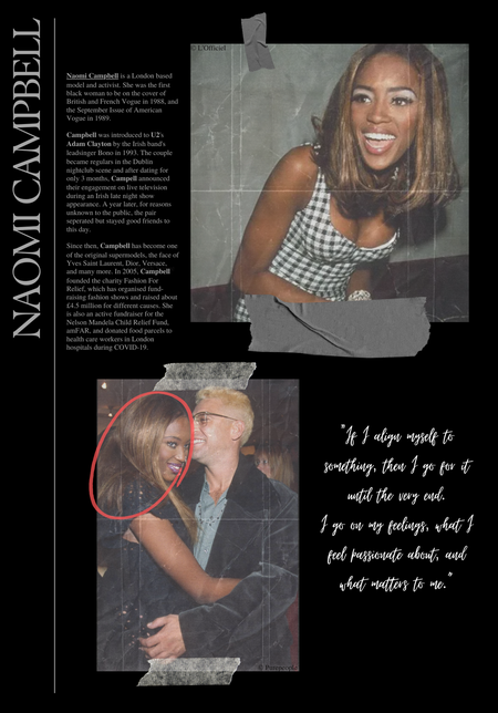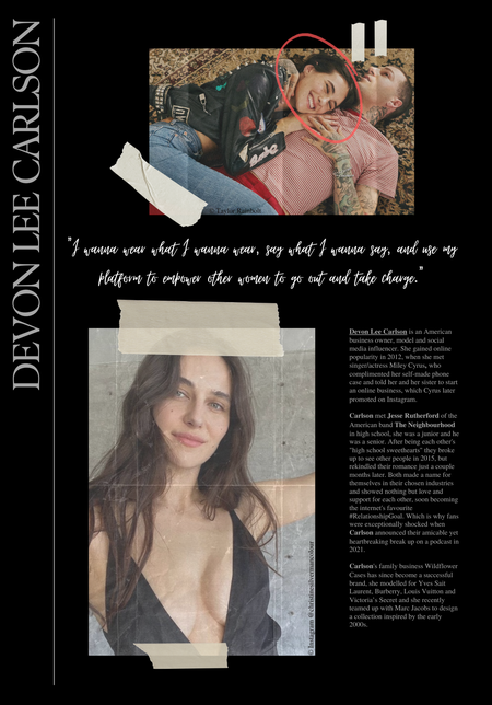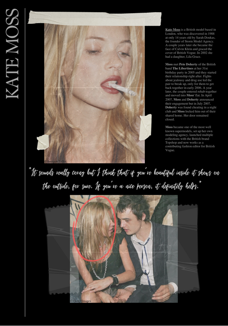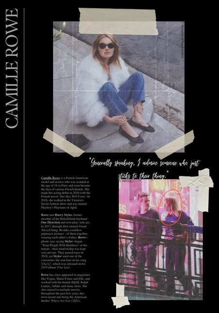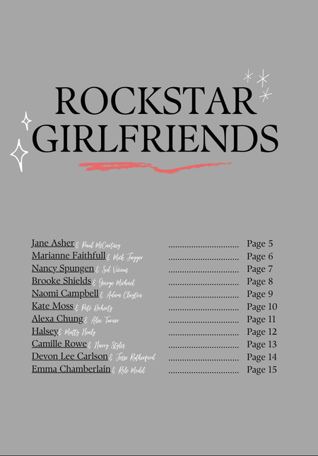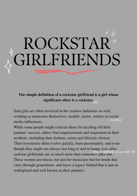 I‘ve always been intrigued by what it must be like to date a musician — especially growing up a massive fangirl — and I‘ve always loved reading about famous relationships, learning all about the romance and the drama. Last spring, the trend of “Rockstar Girlfriend” took over online — a trend that started purely in fashion and aesthetics but unfortunately quickly morphed into glorifying unhealthy behaviours [TW!!!: eating disorders & drug abuse]. The trend mainly drew inspiration by the likes of Kate Moss and Camille Rowe, who are not only professional models, which makes young girls comparing their bodies to theirs harmful enough, but also blonde and white. I found myself captivated by the trend as well, which is why I wanted to do more research on actual “rockstar girlfriends” and their real relationships, not the romanticised versions on social media. I also wanted to explore the possibility of “rockstar girlfriends” who aren’t blonde nor white (sadly most of them are exactly that). I picked out a few women that sparked my interest to research further, additionally making sure different decades would be present. Naturally, I had to include Kate Moss and Camille Rowe. My overall goal was to create a zine that changes the narrative of women who are involved with said “rockstars” and therefore often discredited for their own careers — all the women covered are proof that they work as hard, if not twice as hard as their (ex-)partners.