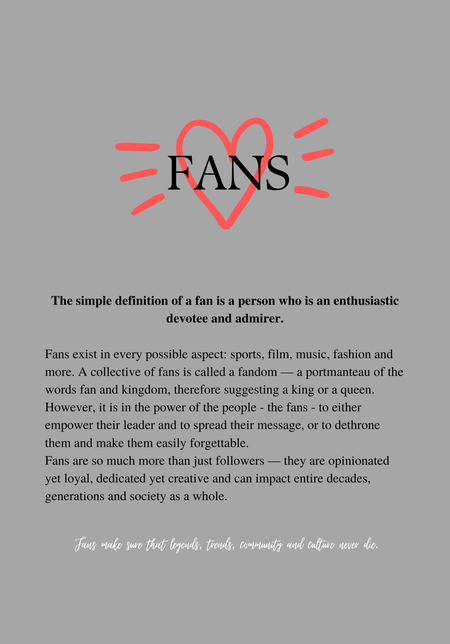 My research confirmed my prior existing belief: being a fan means power. The kind of power that one only benefits from if it‘s on their side. The kind of power that connects people and shapes generations. The kind of power that lasts for a lifetime and beyond.