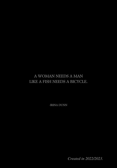 In the process of creating the zine, my best friend Hope Kensall reminded me of the quote “A woman needs a man like a fish needs a bicycle” by Irina Dunn, which I agree with and find extremely fitting for the zine and its narrative so it eventually became the back cover — the last takeaway the reader should have.